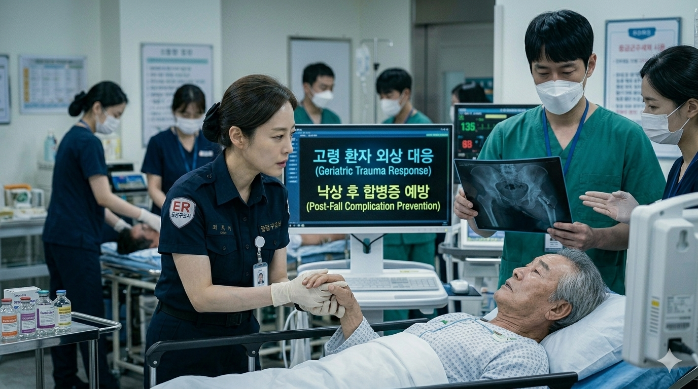 병원 도착 후에는 정형외과적 수술과 함께 재활의학과, 호흡기내과의 협진이 필수적입니다. 저는 수술만 받고 재활을 소홀히 한 환자분들이 결국 보행 능력을 회복하지 못하고 요양원으로 가시는 경우를 너무 많이 봤습니다. 대한노인병학회 자료에 따르면, 고관절 골절 환자의 50% 이상이 1년 후에도 독립 보행이 불가능하다고 합니다. 이 수치는 단순히 뼈를 붙이는 것만으로는 부족하다는 명백한 증거입니다. 정리하면, 노인 낙상은 단순한 정형외과적 사고가 아니라 전신 기능 부전을 초래하는 복합 위기 상황입니다. 제가 응급 현장에서 가장 안타까웠던 순간은, "별일 아니겠지"라고 생각하고 병원 방문을 미루다가 합병증이 진행된 후 뒤늦게 119를 부르시는 경우였습니다. 어르신이 넘어지셨다면, 통증이 심하지 않더라도 반드시 병원에서 정밀 검사를 받으셔야 합니다. 특히 항응고제를 복용 중이거나 골다공증 진단을 받으신 분이라면, 지연성 뇌출혈이나 압박골절 가능성을 배제할 수 없습니다. 낙상 후 48시간이 생존율을 결정한다는 사실을 꼭 기억하시고, 초기 대응에 집중해 주시길 바랍니다. 이 글이 소중한 가족의 생명을 지키는 데 작은 도움이 되기를 진심으로 바랍니다.