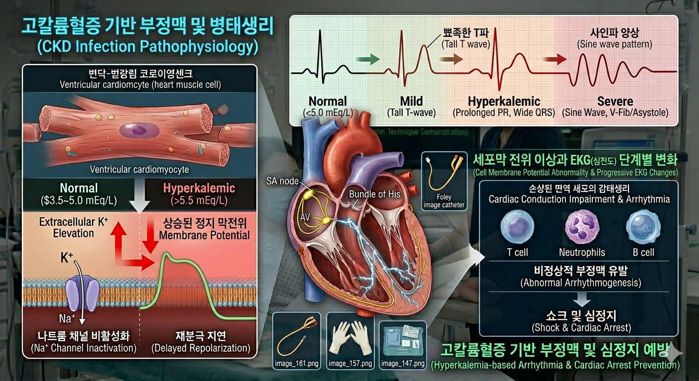 안녕하세요. 응급실(ER)에서 만성 신부전 환자의 심전도(EKG) 모니터에 갑자기 솟구친 '뾰족한 T파(Tall T wave)'를 목격했을 때, 환자의 심장이 곧 멈출 수 있다는 직감에 온몸의 신경을 곧세우던 전직 응급구조사입니다. 오늘은 만성 신부전 환자의 가장 급박한 합병증인 '고칼륨 혈증'의 병태생리와 쇼크 상황을 막기 위한 전문적인 전해질 교정 전략을 분석해 보겠습니다. 이 글을 통해 칼륨 수치 상승이 어떻게 심장의 전기 신호를 교란하는지 명확히 이해하고, 조기 발견을 통해 치명적인 심정지의 위협을 차단하는 의학적 통찰을 얻으시길 바랍니다.
