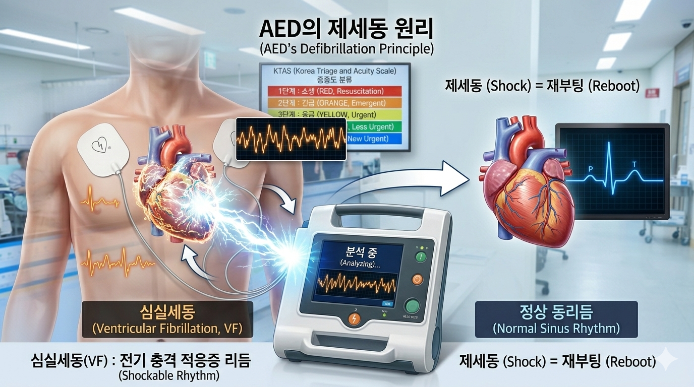 응급 상황에서 자동심장충격기(AED)는 환자의 생존율을 비약적으로 높이는 핵심 장비이지만, 많은 분이 모든 심정지 환자에게 AED가 전기 충격을 줄 것이라고 오해하곤 합니다. 하지만 AED는 이름 그대로 '제세동(Defibrillation)', 즉 심장의 미세한 떨림을 제거하는 장비이지 멈춘 심장을 다시 뛰게 하는 마법의 기구가 아닙니다. 오늘은 응급실 현장에서의 경험과 전문심장소생술(ACLS) 가이드라인을 바탕으로, 왜 AED가 특정 상황에서만 작동하는지 그 의학적 이유를 상세히 설명해 드립니다. 이 글을 통해 제세동기의 정확한 메커니즘을 이해하고, 실제 상황에서 당황하지 않고 대처할 수 있는 신뢰도 높은 지식을 얻으시길 바랍니다.
