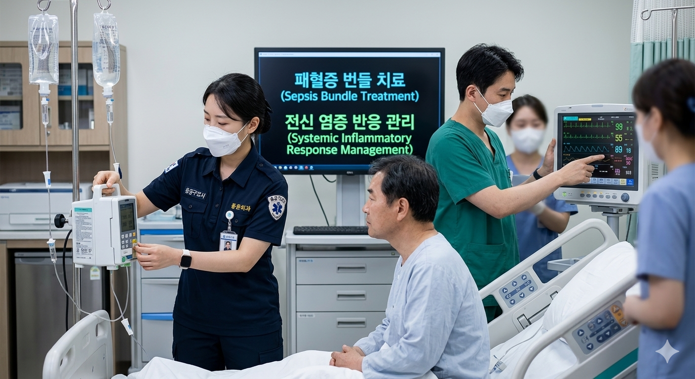 패혈증이 의심되는 순간부터 응급실은 전쟁터가 됩니다. 'Surviving Sepsis Campaign' 가이드라인에 따르면, 패혈증 진단 후 1시간 이내에 반드시 수행해야 하는 핵심 처치들이 있습니다. 이를 '패혈증 번들(Sepsis Bundle)'이라고 부릅니다. 번들 치료의 핵심 단계는 다음과 같습니다:
